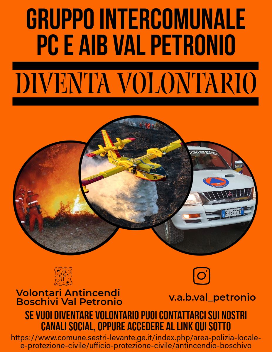 Il Comune di Sestri Levante insieme ai Comuni di Casarza Ligure, Castiglione Chiavarese e Moneglia ha costituito la SQUADRA INTERCOMUNALE DI PROTEZIONE CIVILE e ANTINCENDIO BOSCHIVO “Val Petronio” per attuare in forma unitaria e coordinata gli interventi di antincendio boschivo e di protezione civile durante glie venti meteo eccezionali rivolti a tutelare l’integrità della vita umana, i beni, gli insediamenti e l’ambiente dai danni o dal pericolo derivanti da eventi calamitosi, attuando in coordinamento con la Regione Liguria, il Corpo Nazionale dei Vigili del Fuoco e gli altri enti competenti le azioni di prevenzione a salvaguardia ambientale.