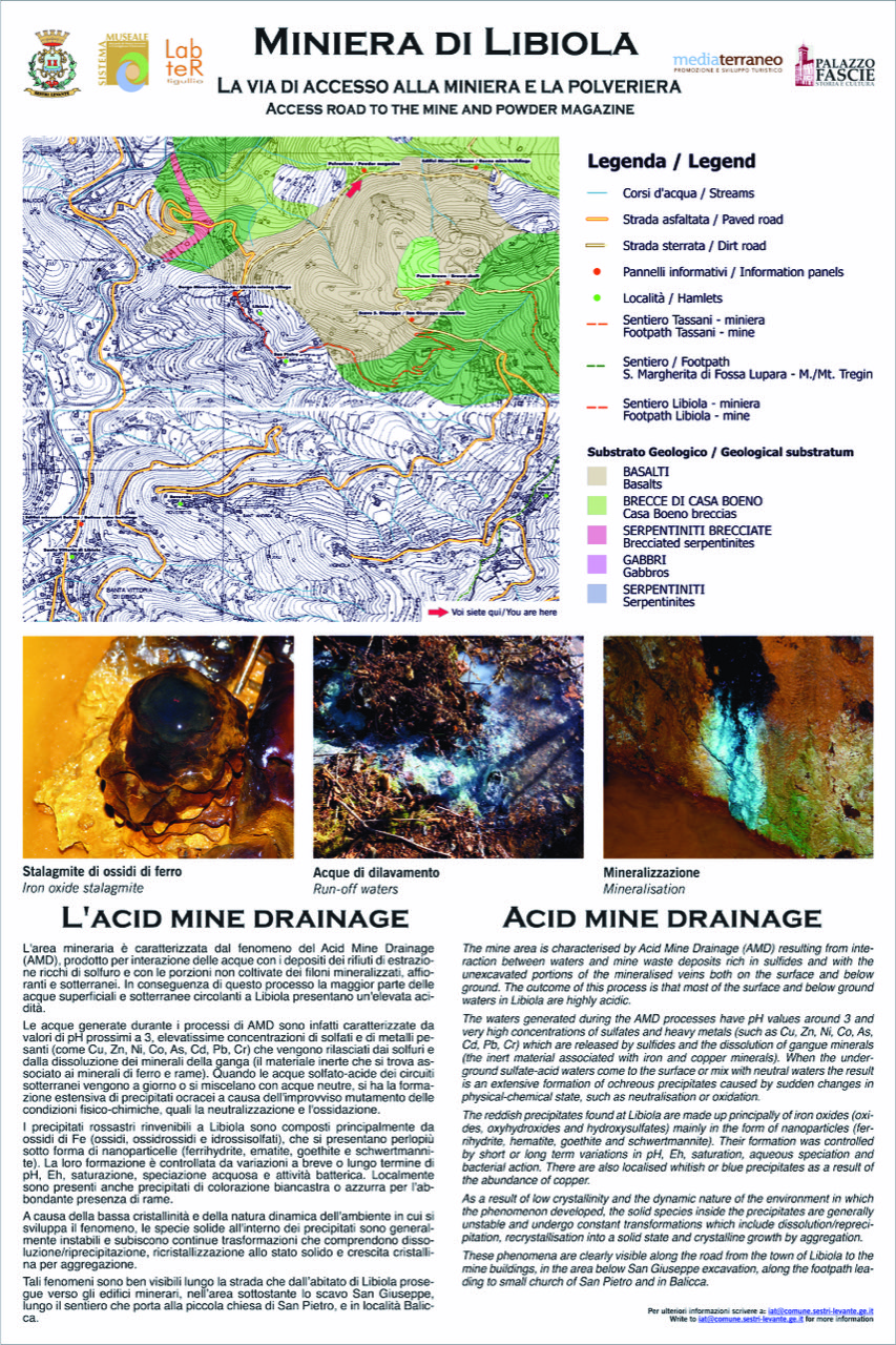 The mine area is characterised by Acid Mine Drainage (AMD) resulting from interaction between waters and mine waste deposits rich in sulfides and with the unexcavated portions of the mineralised veins both on the surface and below ground. The outcome of this process is that most of the surface and below ground waters in Libiola are highly acidic.