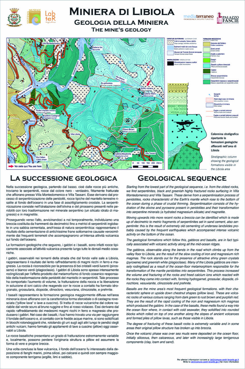 The geological formations surfacing in the Libiola area date from the Middle Jurassic (approx. 160 million years ago) to the Upper Cretaceous (approx. 80 million years ago) and belong to tectonic units attributed to the so-called Internal Ligurids of the Northern Apennines, i.e. to fragments of the crust of an ancient ocean which separated the European from the African continent. During the Apennine orogeny the tectonic units belonging to the Ligurids piled up (thrust over) the European continental margin.