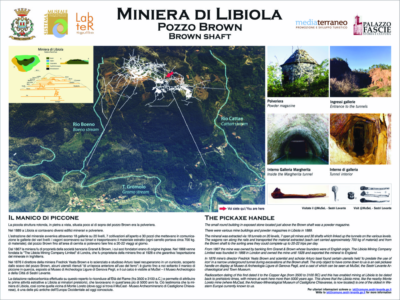The ancient origins of copper mining here is testified to by both the finding of the pickaxe handle in a narrow underground tunnel in the Brown shaft and by the recent discovery of a mallet and a millstone now on show at MuSeI, the Sestri Levante Archaeological and Town Museum, which were used by prehistoric miners to extract and work the mineral. The mallet was found at the modern San Giuseppe excavation.